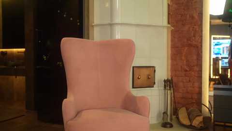Video of a woman in black lingerie, thigh-high stockings, and high heels, facing away in a modern bedroom with pink armchair, green hanging lights, and sheer curtains.