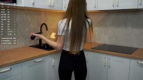 raquelwardman - Video of a young Caucasian woman with long, straight brown hair, wearing a tight white t-shirt that emphasizes her large breasts, standing in a modern kitchen with white cabinets and a wooden countertop.