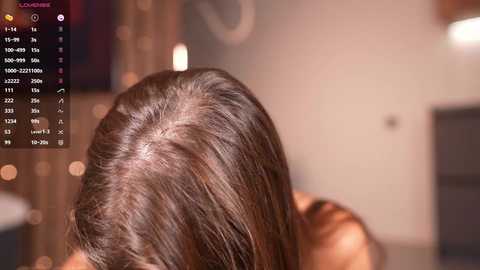 A video of a woman with long, wavy brown hair, taken from behind, showing her hair texture and a blurry, modern bedroom with a bed and lamp in the background.